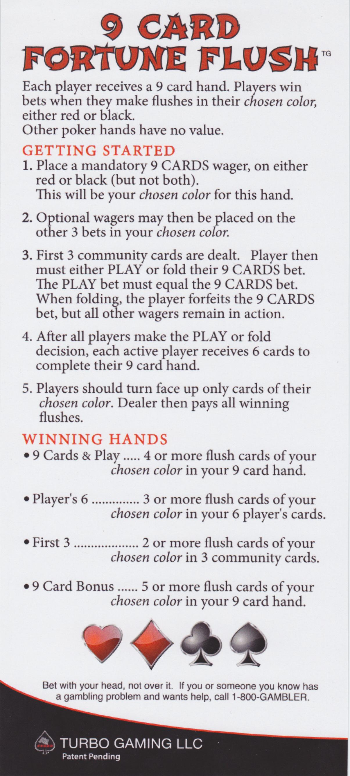 - खेल की शुरुआत खिलाड़ी द्वारा लाल या काले रंग पर 9 पत्तों का दांव लगाने से होती है। खिलाड़ी दोनों रंगों पर दांव नहीं लगा सकता। यह एकमात्र अनिवार्य दांव है।