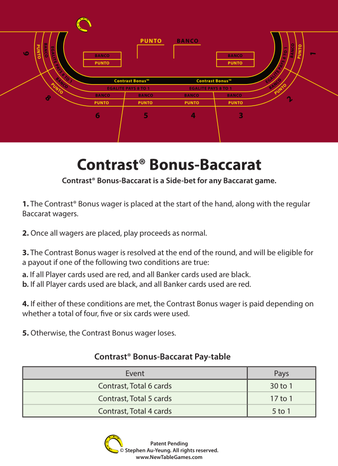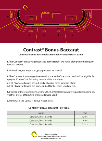 कंट्रास्ट बोनस बैकारेट एक बैकारेट साइड बेट है जो तभी भुगतान करता है जब सभी खिलाड़ी के कार्ड एक ही रंग के हों और सभी बैंकर के कार्ड विपरीत रंग के हों। जीत कुल कार्डों पर निर्भर करती है। इसकी पहली बार शुरुआत स्विट्जरलैंड के कैसीनो एडमिरल में हुई थी।