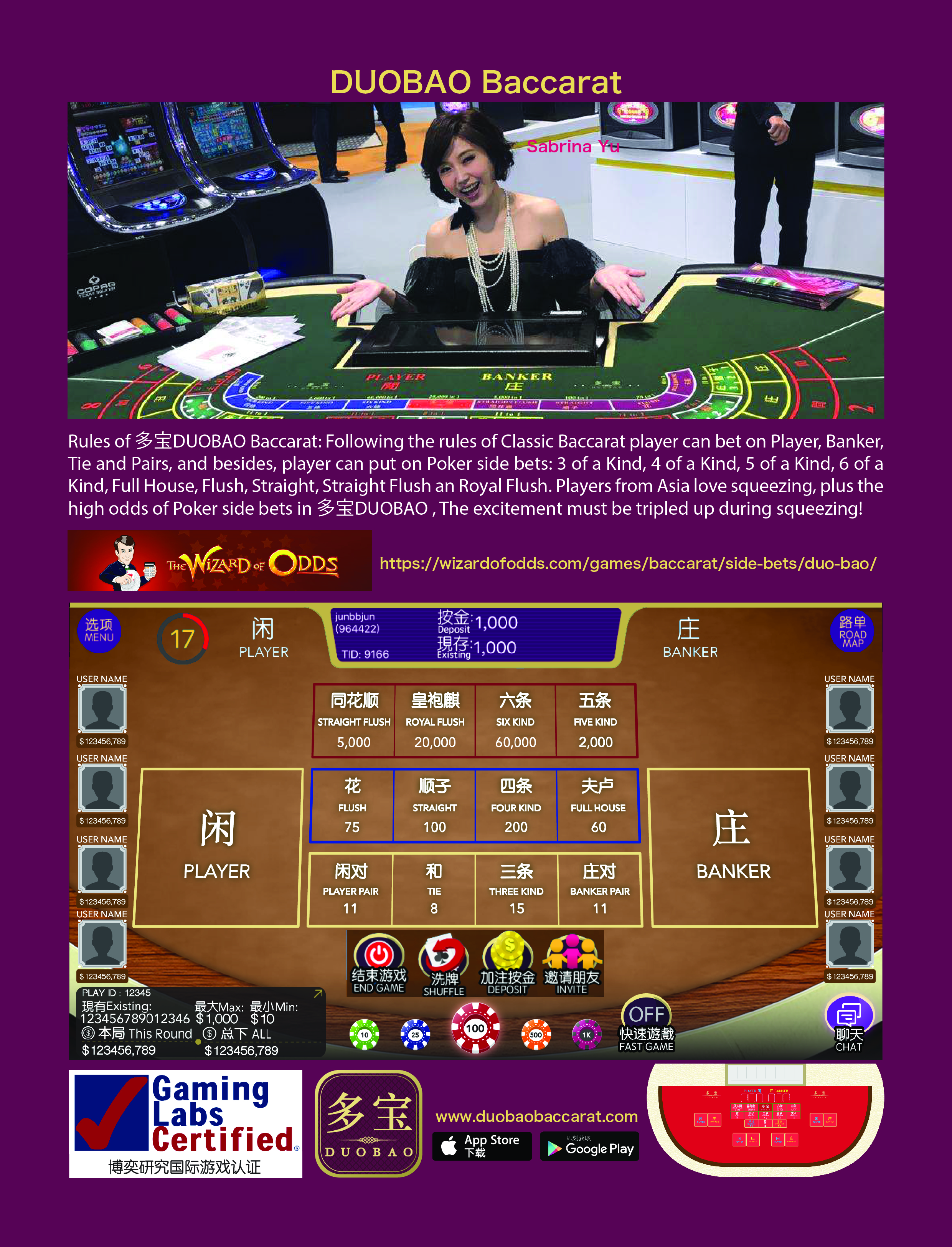 अगर मेरी चीनी भाषा सही है, तो डुओ बाओ का मतलब है ढेर सारा खजाना। यह एक बैकारेट गेम है जिसमें कई पोकर-आधारित साइड बेट्स होते हैं। चूँकि बैकारेट के नियम पारंपरिक बैकारेट जैसे ही हैं, इसलिए मैं इस गेम को बैकारेट साइड बेट्स के संग्रह के रूप में दर्ज करूँगा।