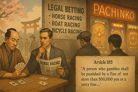 जापान में जुए का कानूनी पक्ष सख्त है। आपराधिक संहिता पैसे के लिए सट्टेबाजी के लगभग सभी रूपों पर प्रतिबंध लगाती है , कुछ अपवादों को छोड़कर जैसे घुड़दौड़, कुछ मोटर स्पोर्ट्स और राष्ट्रीय लॉटरी।