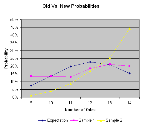 स्टेशन कैसिनोज़ के स्टीफ़न एल. कैवेलारो से बातचीत के आधार पर, मुझे सैम्स टाउन में 10 से 15 ऑड्स या 9 से 14 सम संख्याएँ मिलने की उम्मीद थी। हालाँकि, मुझे 8 सम संख्या वाला एक कार्ड मिला, और 9 सम संख्या वाला भी सिर्फ़ एक कार्ड। किसी भी दिए गए कार्ड के 8 से 14 सम संख्याएँ होने की प्रायिकता 0.881703 है। 102 के इस श्रेणी में आने की प्रायिकता 2.647786 * 10 -6 , यानी 377,674 में 1 है।