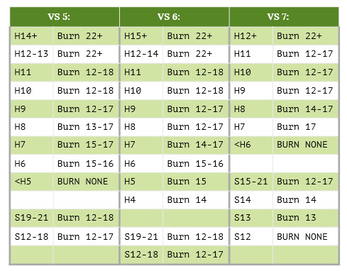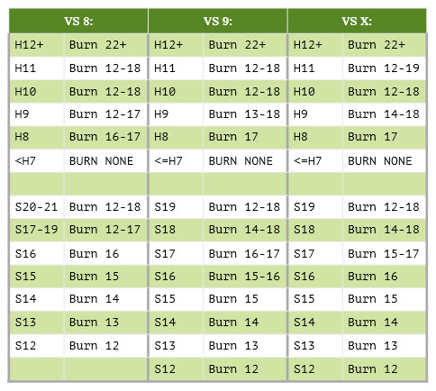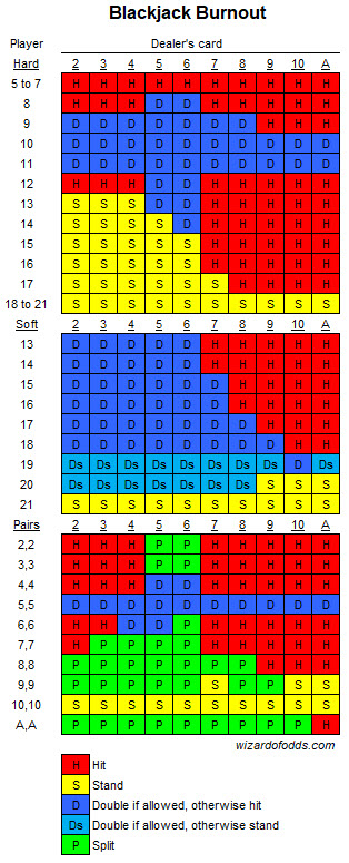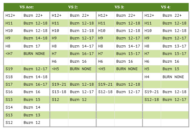 यदि बर्नआउट विकल्प अभी भी उपलब्ध है, तो निम्नलिखित मूल रणनीति अपनाएँ। यदि यह उपलब्ध नहीं है, तो खिलाड़ी को पारंपरिक ब्लैकजैक मूल रणनीति का उपयोग करना चाहिए।