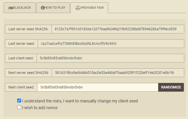 ऊपर दी गई तस्वीर, फेयर गेमिंग पैनल से, शर्त लगाने से पहले ली गई थी। एक निष्पक्ष खेल सुनिश्चित करने के लिए ज़रूरी चीज़ें हैं: एक नया क्लाइंट सीड (कुछ यादृच्छिक अक्षर पर्याप्त होंगे) और अगले सर्वर सीड का हैश दर्ज करना और रिकॉर्ड करना, जिसे खेल में "अगला सर्वर सीड SHA256" शीर्षक दिया गया है। ये रहे: