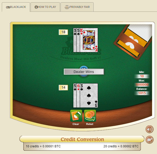 ऊपर दी गई तस्वीर में, मैं 0.00001 BTC (बिटकॉइन) के दांव से शुरुआत करता हूँ, जो लगभग 10¢ के बराबर है। वे खिलाड़ी को इस दांव का इस्तेमाल दस चिप्स खरीदने के लिए करते हैं और फिर पूरे दस चिप्स दांव पर लगाने के लिए कहते हैं। मुझे नहीं पता कि वे इस कदम से पानी को गंदा क्यों करते हैं।