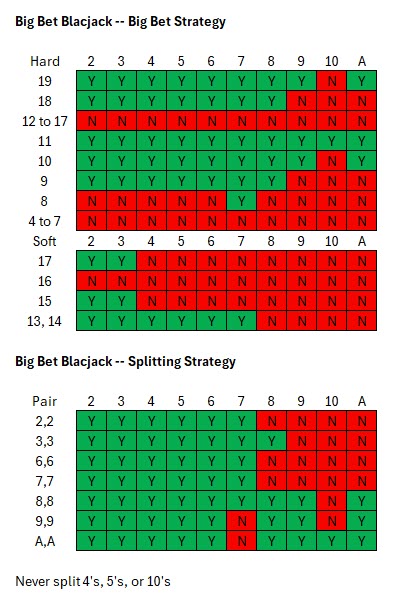 निम्नलिखित रणनीति बताती है कि कब बड़ा दांव लगाना है और कब विभाजित करना है। अन्यथा, हिटिंग और स्टैंडिंग के लिए पारंपरिक ब्लैकजैक रणनीति का उपयोग करें।