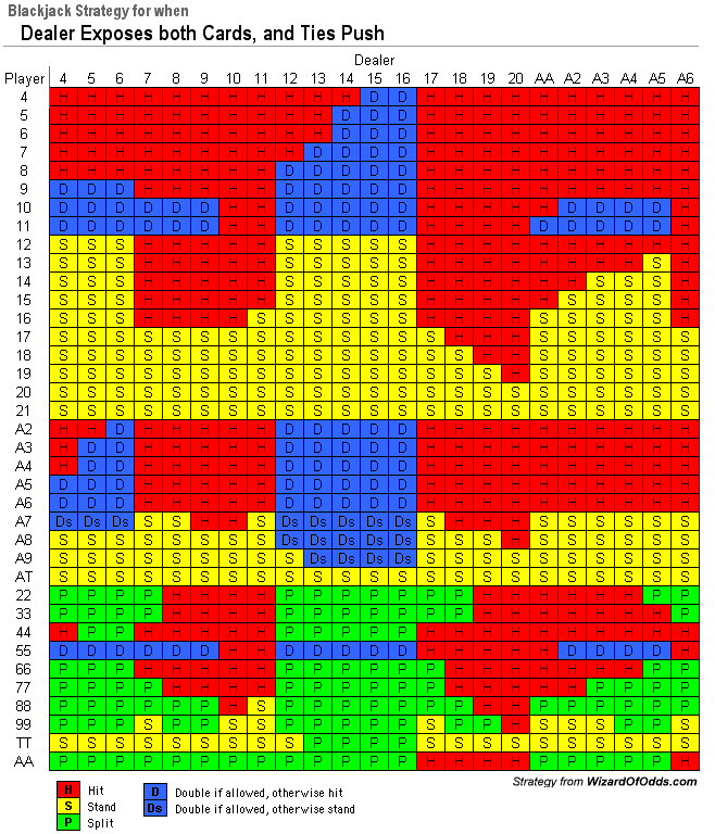 कभी-कभी, गलती से या प्रमोशन के तहत, डीलर दोनों पत्ते खोल देता है। इसे डबल एक्सपोज़र से भ्रमित न करें, जिसमें बराबरी पर हार होती है। निम्नलिखित मूल रणनीति है, जो अनंत डेक पर आधारित है, जब डीलर के दोनों पत्ते खोल दिए जाते हैं और डीलर सॉफ्ट 17 पर होता है।