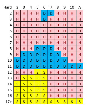 अन्यथा, किसी भी कठिन कुल के साथ, खिलाड़ी को निम्नलिखित बुनियादी रणनीति तालिका का पालन करना चाहिए।