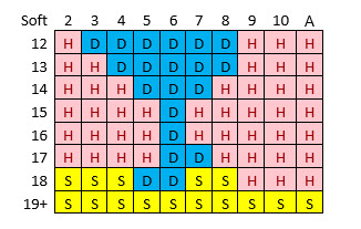 किसी भी सॉफ्ट टोटल के साथ, खिलाड़ी को निम्नलिखित बुनियादी रणनीति तालिका का पालन करना चाहिए।