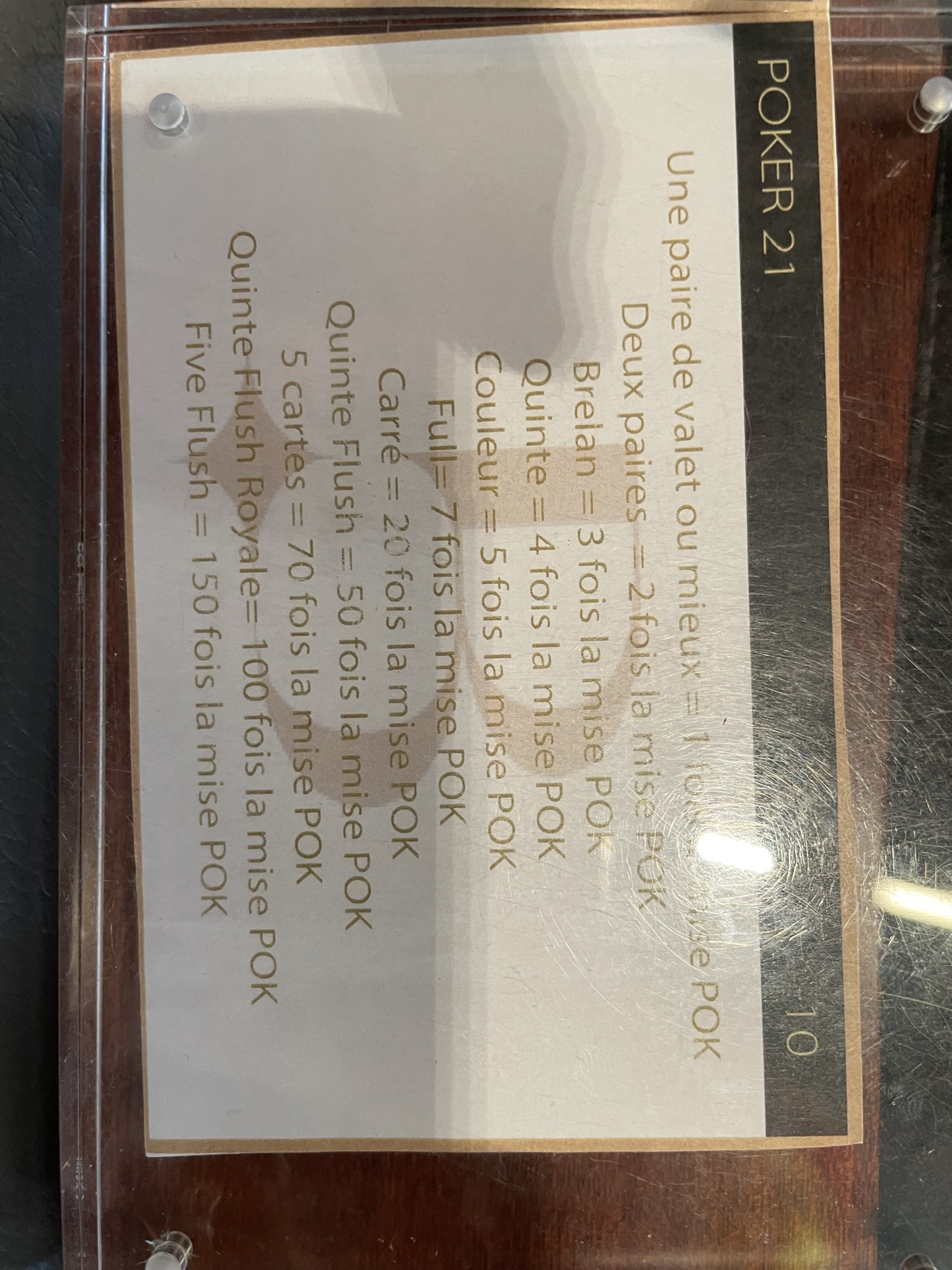 पोकर 21 एक ब्लैकजैक साइड बेट है जिसे मैंने 17 सितंबर, 2022 को पेरिस के ले क्लब बैरियर में देखा था। जी हाँ, पेरिस में छोटे-छोटे टेबल-ओनली कैसिनो हैं। जिस क्लब में मैं गया था उसका पता 104 चैंप्स एलिसीज़ था।