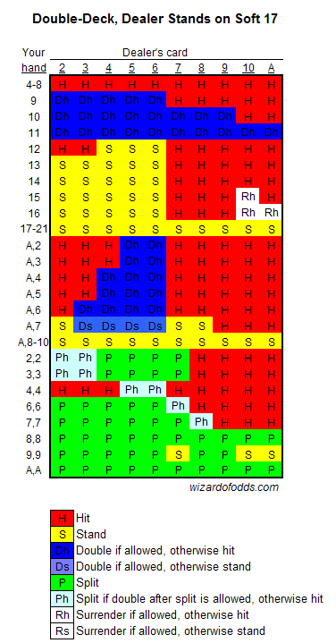 आदर्श रूप से, मूल रणनीति वह चाल दिखाती है जो औसतन, प्रत्येक शुरुआती हाथ में सबसे बड़ी जीत या सबसे कम हार का परिणाम देगी। मैं आमतौर पर ऐसा केवल शुरुआती 2-कार्ड वाले हाथों को देखकर करता हूँ। सामान्यतः, इससे समग्र रूप से सर्वश्रेष्ठ चाल प्राप्त होगी। हालाँकि, जब डीलर सॉफ्ट 17 पर खड़ा होता है, तो डीलर ऐस के विरुद्ध सॉफ्ट 18, एकमात्र ज्ञात अपवाद है जिसके बारे में मैं किसी भी डेक के लिए जानता हूँ। जैसा कि मेरे ब्लैकजैक परिशिष्ट 9 में दिखाया गया है, 2-कार्ड वाले सॉफ्ट 18 बनाम A का हिट होने का अपेक्षित मान -0.100359 है, और स्टैंडिंग का -0.100502। इसलिए दो पत्तों के साथ हिट होना थोड़ा बेहतर है। हालाँकि, सभी सॉफ्ट 18 दो पत्तों से बने नहीं होते। खिलाड़ी के हाथ में जितने अधिक पत्ते होंगे, स्टैंडिंग की संभावना उतनी ही अधिक होगी। सिमुलेशन दिखाते हैं कि अगर हमेशा हिट करने या हमेशा स्टैंडिंग करने के लिए मजबूर किया जाए, तो स्टैंडिंग करना बेहतर है। मैं डॉन श्लेसिंगर को इस असामान्य चाल की ओर मेरा ध्यान आकर्षित करने के लिए धन्यवाद देना चाहता हूँ।