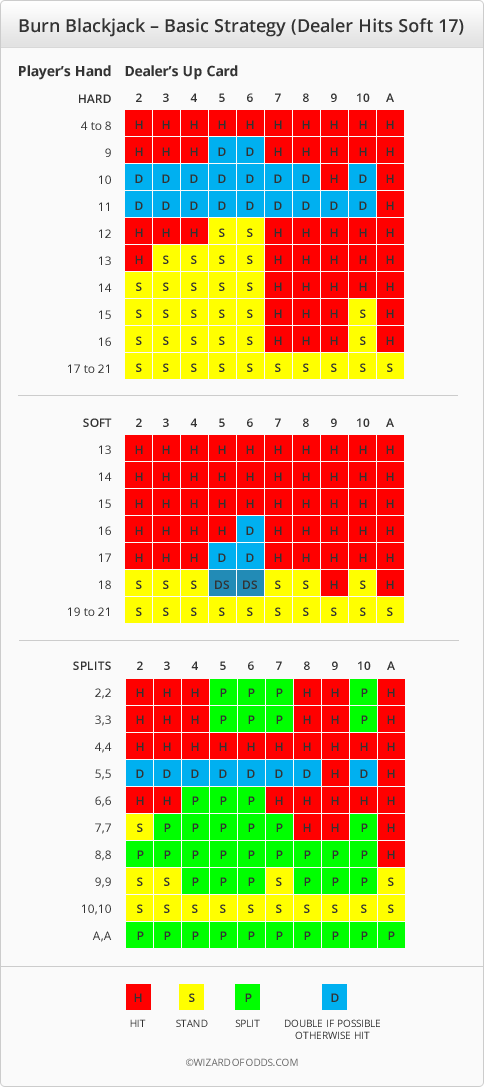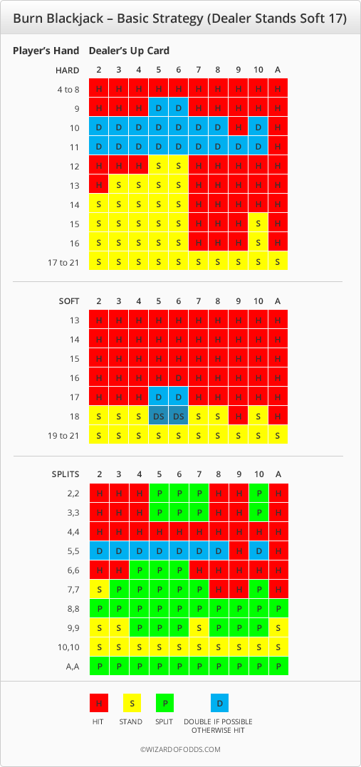 निम्नलिखित तालिकाएं मूल रणनीति को दर्शाती हैं, जो इस बात पर निर्भर करती है कि डीलर सॉफ्ट 17 पर हिट करता है या खड़ा रहता है: