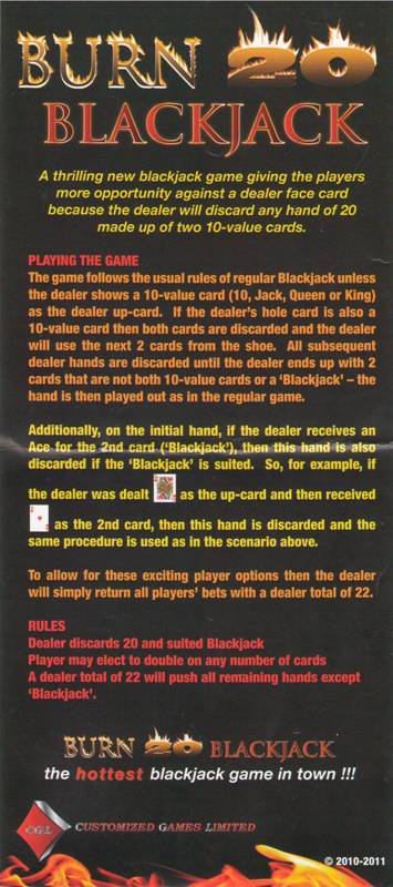 बर्न 20 ब्लैकजैक, ब्लैकजैक का एक प्रकार है जिसे मैंने पहली बार जुलाई 2011 में डाउनटाउन लास वेगास के बिनियन्स में देखा था। यह खेल नियमित ब्लैकजैक पर आधारित है, जिसमें कुछ बदलाव हैं। इसकी अवधारणा यह है कि खिलाड़ी को 20 के हार्ड कार्ड के खिलाफ खेलने की चिंता नहीं करनी पड़ती। इसके लिए, अगर डीलर 22 अंकों के साथ बस्ट हो जाता है, तो बचे हुए खिलाड़ी जीतने के बजाय पुश करेंगे।