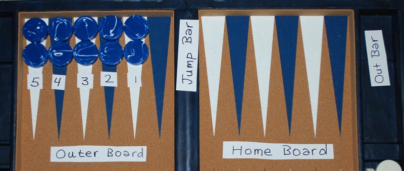 - आउट बार : बाहरी बोर्ड के दूसरी तरफ़ स्थित बार। दूसरे/तीसरे रोल का लक्ष्य दोनों टुकड़ों को आउट बार के ऊपर पहुँचाना है।