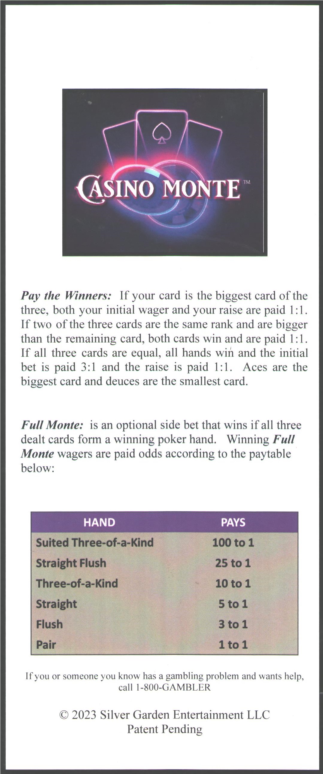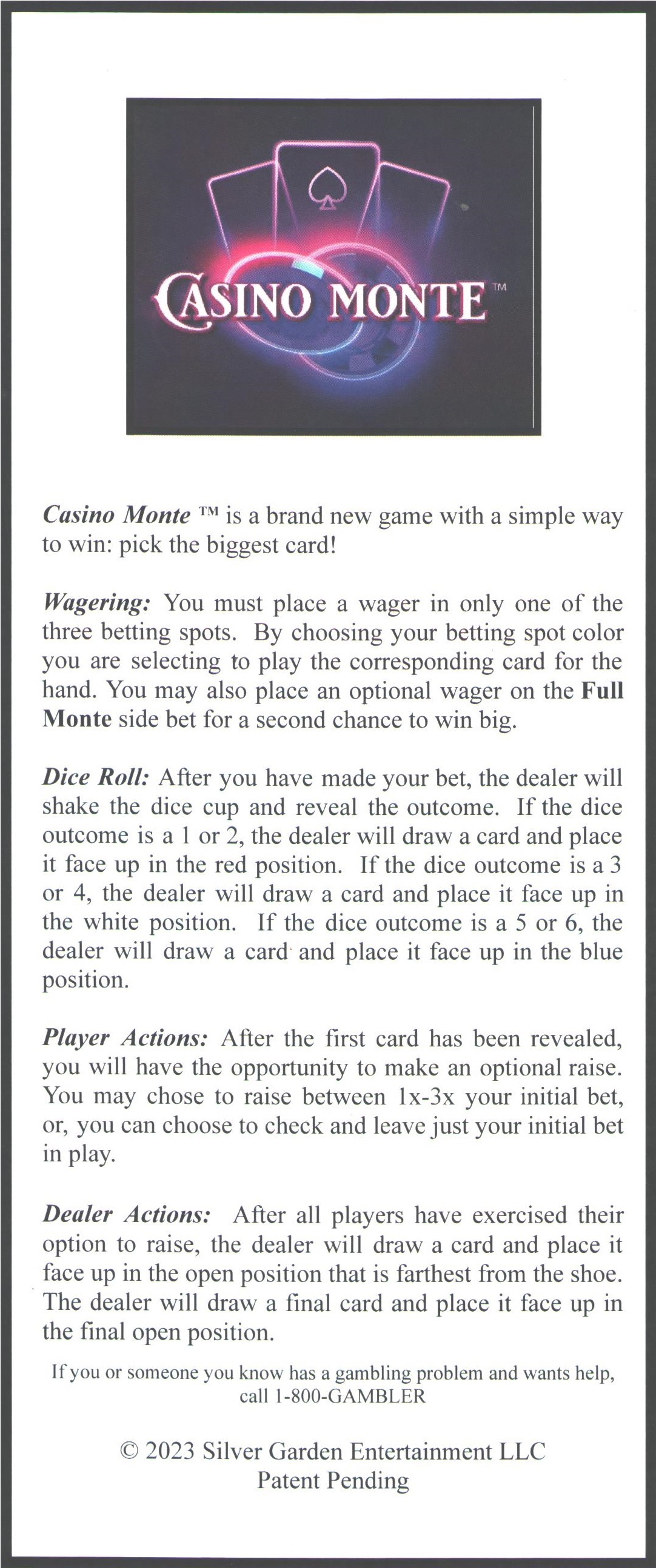 कैसीनो मोंटे तीन पत्तों वाला एक सरल कैसीनो गेम है। अगर खिलाड़ी सबसे ज़्यादा पत्तों वाली स्थिति का अनुमान लगा लेता है तो वह जीत जाता है। बराबरी पर जीतने पर जीत मिलती है और एक पत्ता खुलने के बाद दांव बढ़ाने का मौका मिलता है।