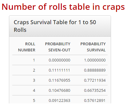 मुझसे अक्सर एक सवाल पूछा जाता है, "क्रेप्स में किसी शूटर के x रोल तक टिके रहने की प्रायिकता क्या है?" नीचे दी गई तालिका 50 रोल तक के लिए इस सवाल का जवाब देती है। पहला कॉलम रोल नंबर है। दूसरा कॉलम ठीक उसी रोल पर सात आउट होने की प्रायिकता है। तीसरा कॉलम उस रोल के बाद बचे रहने की प्रायिकता है।