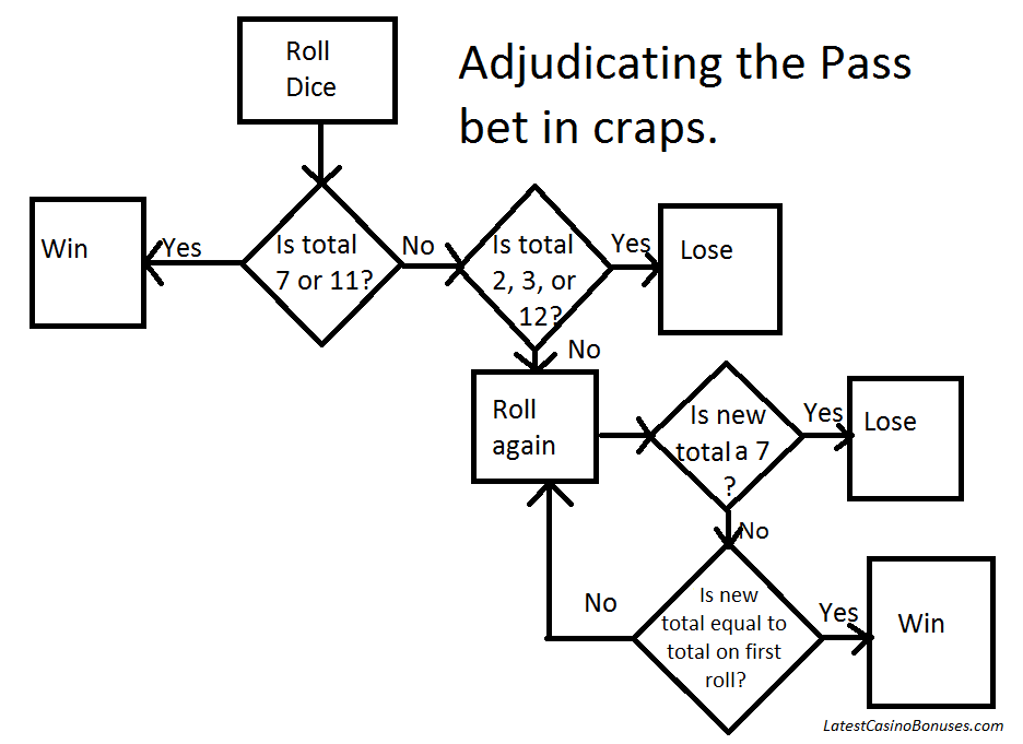 पास बेट, कम आउट रोल पर पास लाइन पर ही लगाई जाती है। अगर टेबल पर "ऑफ" लिखा काला लैमिनेटेड मार्कर हो, तो आप बता सकते हैं कि यह कम आउट रोल है। अगर कम आउट रोल 7 या 11 आता है, तो आप बराबर राशि जीतते हैं। अगर कम आउट रोल 2, 3, या 12 आता है, तो आप हार जाते हैं। अगर कोई और योग (4, 5, 6, 8, 9, या 10) आता है, तो उस योग को "पॉइंट" कहते हैं। डीलर "ऑफ" लिखे मार्कर को सफ़ेद "ऑन" वाले हिस्से में पलट देगा और उसे टेबल पर उस नंबर वाले हिस्से पर रख देगा, ताकि खिलाड़ियों को पॉइंट याद रहे। फिर, शूटर तब तक पासा घुमाएगा जब तक कि उसे दोबारा वही पॉइंट या 7 न आ जाए। अगर पॉइंट से पहले 7 आता है, तो आप हार जाते हैं। अगर पॉइंट पहले आता है, तो आप बराबर राशि जीत जाते हैं।
