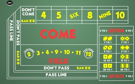 फ़ील्ड एक बार का दांव है कि अगला रोल 2, 3, 4, 9, 10, 11, या 12 होगा। सभी जीत पर 1 से 1 का भुगतान होता है, सिवाय 2 और 12 के जो ज़्यादा भुगतान करते हैं। लास वेगास में ज़्यादातर कैसीनो 2 पर 2 से 1 और 12 पर 3 से 1 का भुगतान करते हैं। रेनो में, वे इन्हें बदल देते हैं, 2 पर 3 से 1 और 12 पर 2 से 1 का भुगतान करते हैं। नीचे दी गई तालिका संभावित परिणाम दिखाती है। नीचे दाएँ सेल में 2.78% का हाउस एज दिखाया गया है।
