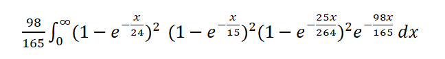 इसे हाथ से एकीकृत करना बहुत थकाऊ और त्रुटिपूर्ण होगा। सौभाग्य से, समाकलन कैलकुलेटर उपलब्ध हैं। इस समस्या के लिए, लिंक पर क्लिक करें और ऊपर दिए गए टेक्स्ट बॉक्स में निम्नलिखित लिखें: (1-exp(-x/24))^2*(1-exp(-x/15))^2*(1-exp(-25x/264))^2*exp(-98x/165)/(165/98)। फिर विकल्पों पर क्लिक करें और निचली सीमा को 0 और ऊपरी सीमा को अनंत पर सेट करें। फिर "गो" पर क्लिक करें।