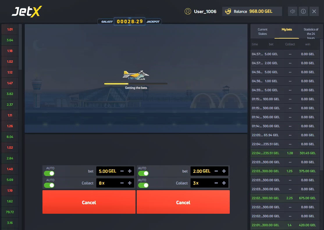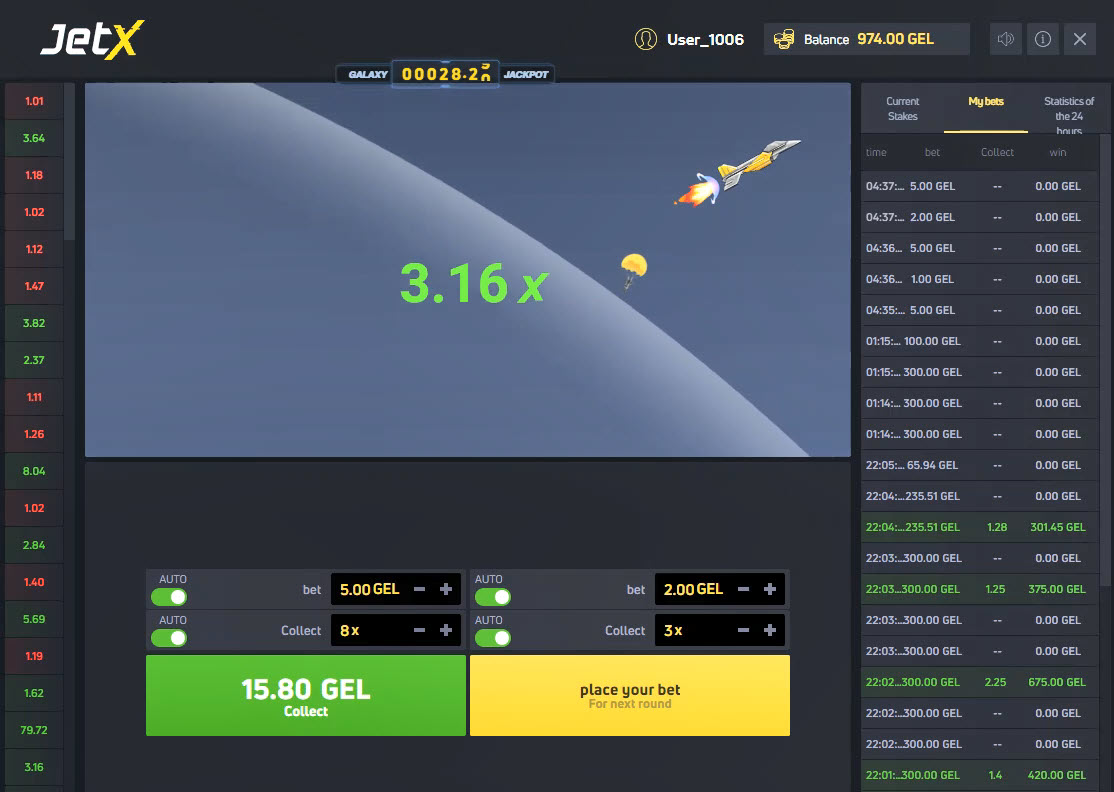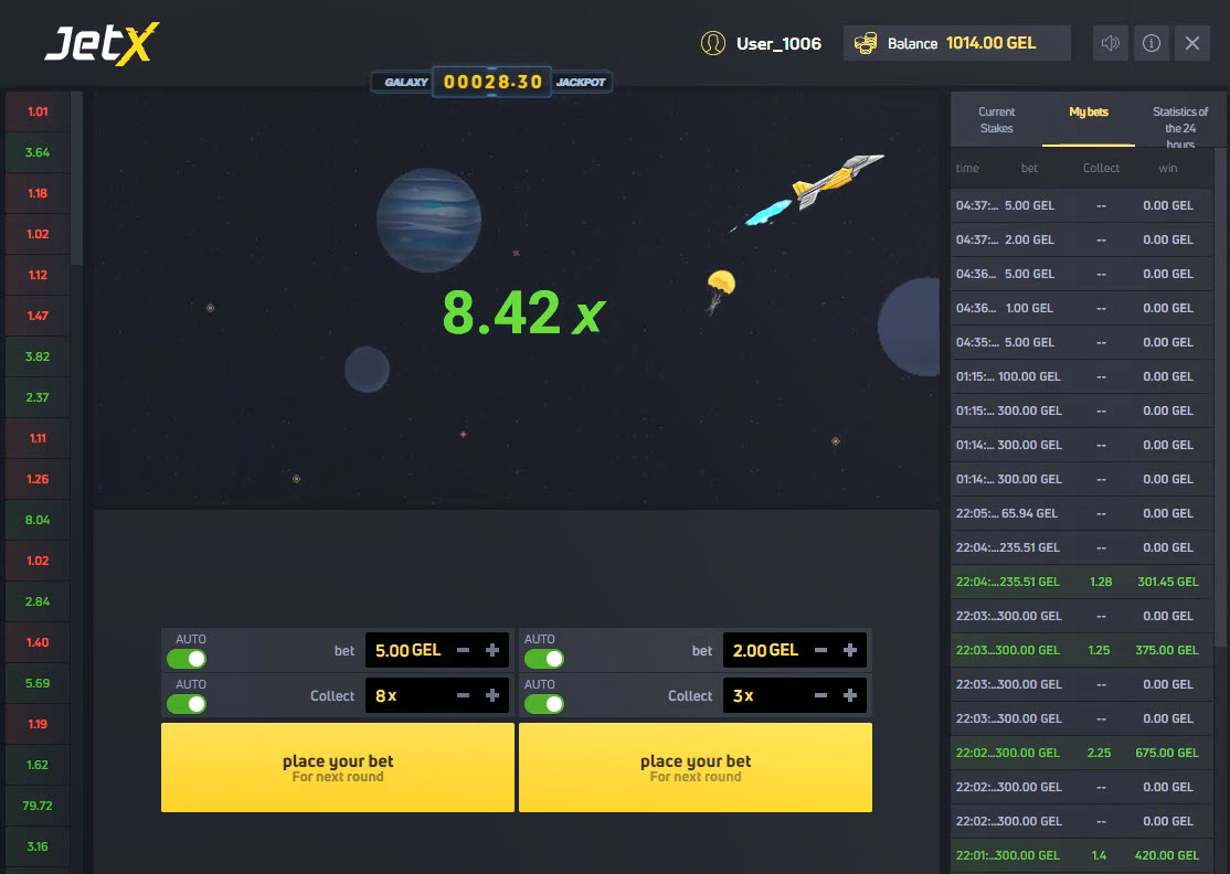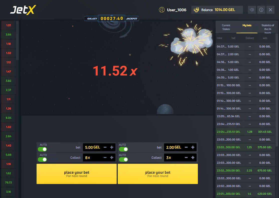 इससे कोई फ़र्क़ नहीं पड़ता, लेकिन अंतरिक्ष यान तब तक ऊपर जाता रहता है जब तक कि वह फट न जाए, और इस मामले में विस्फोट 11.52x के गुणक पर हुआ। मेरे बैलेंस पर भी ध्यान दें, 1014 GEL। याद दिला दूँ कि दांव लगाने के बाद, मेरा बैलेंस 968 था। बाएँ दांव पर 5×8 = 40 आया। दाएँ दांव पर 2×3 = 6 आया। मेरी कुल जीत 40+6 = 46 हुई। इस तरह मेरा नया बैलेंस 968+46 = 1014 है।