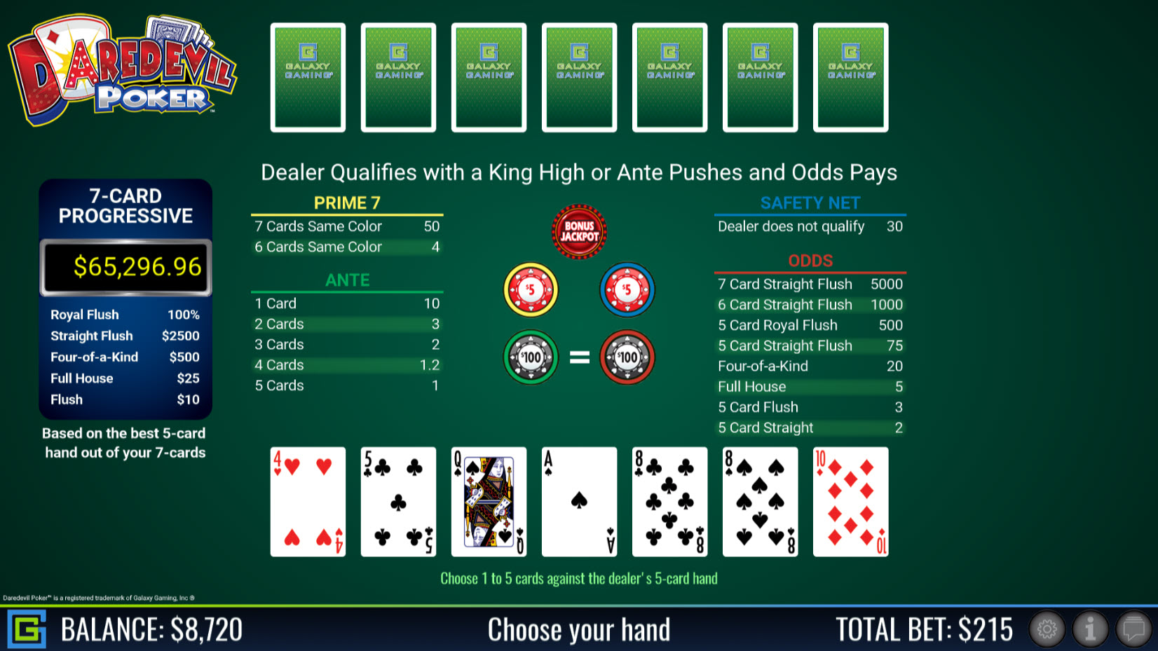 डेयरडेविल पोकर एक पोकर-प्रकार है जिसमें खिलाड़ी और डीलर दोनों को सात-सात कार्ड मिलते हैं, और जो हाथ ज़्यादा ऊँचा होता है वह जीत जाता है। खिलाड़ी चुन सकता है कि डीलर के खिलाफ कितने कार्ड खेलने हैं, जितने कम कार्ड होंगे, उसकी जीत की संभावना उतनी ही ज़्यादा होगी।