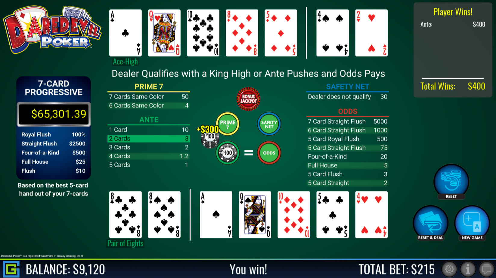- यदि डीलर कम से कम किंग-हाई प्राप्त नहीं करता है तो "सेफ्टी नेट" साइड बेट जीत जाता है और 30 से 1 का भुगतान करता है।