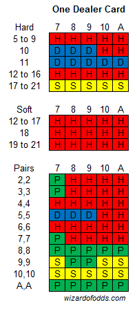 अगली तालिका में डीलर के एक कार्ड के विरुद्ध रणनीति दर्शाई गई है, जो चार से आठ डेक के लिए नियमित ब्लैकजैक के समान है, तथा डीलर सॉफ्ट 17 पर पहुंचता है।