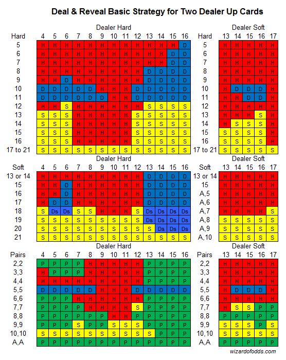 रणनीति इस बात पर निर्भर करती है कि डीलर एक या दो कार्ड दिखा रहा है, क्योंकि दो डीलर कार्डों के विरुद्ध 22 का पुश होता है। पहली तालिका दो डीलर कार्डों के विरुद्ध रणनीति दर्शाती है।