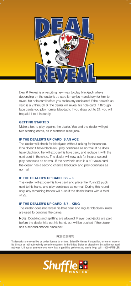 डील एंड रिवील ब्लैकजैक का एक प्रकार है जिसमें कुछ मोड़ हैं। मुख्य मोड़ यह है कि अगर डीलर के पास 2 से 6 तक का कार्ड है, तो वह खिलाड़ी की बारी से पहले अपना होल कार्ड दिखा देगा।