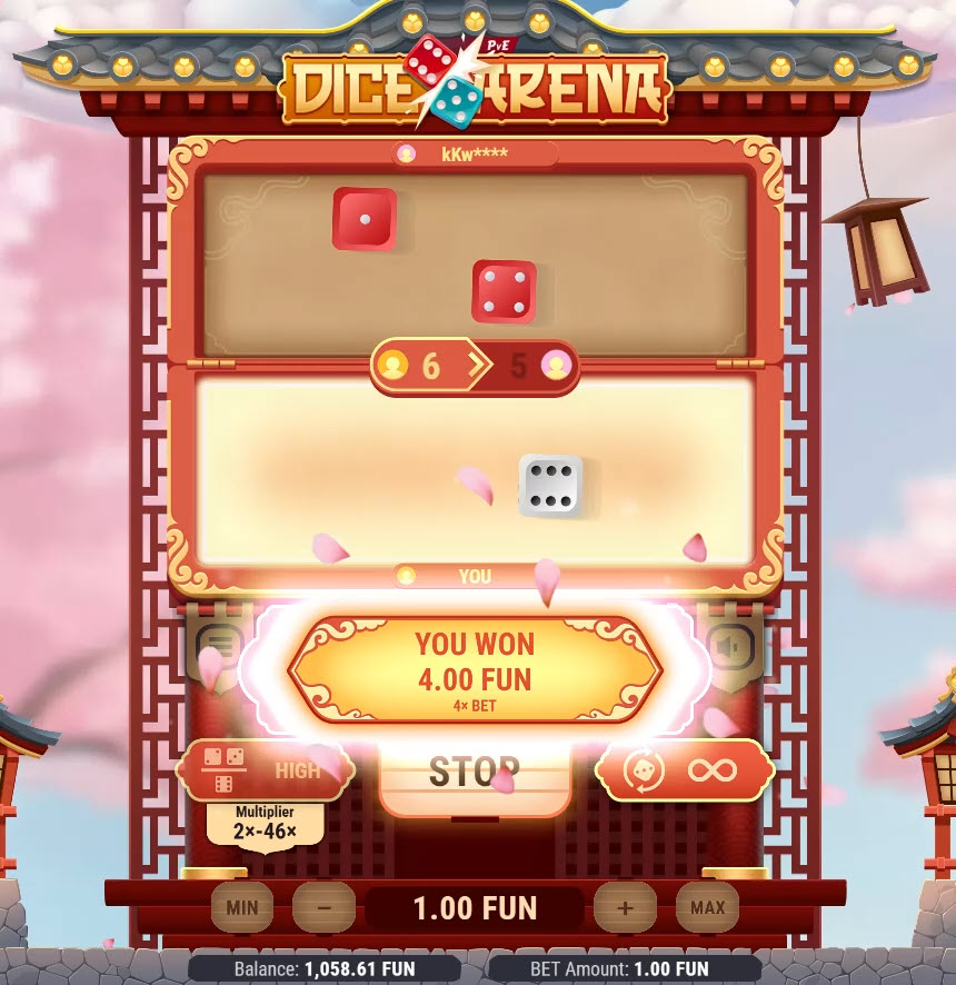 ऊपर दी गई तस्वीर में मैंने "हाई" मोड में $1 का दांव लगाया है, यानी डीलर के दो पासों के मुकाबले मेरा एक पासा। मेरे छह पासों ने डीलर के कुल 5 पासों को हरा दिया। मेरी जीत 1 में से 4 थी।