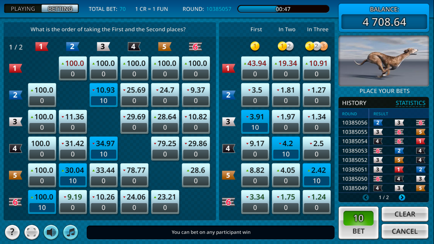 InBet, Dogs 3D की एक स्किन, जिसे ट्रॉन रेस कहा जाता है, पेश करता है। यह फिल्म पर आधारित छह डिजिटल रेस कारों की रेस पर आधारित है। जीत, जगह और शो बेट्स के लिए मुझे 92.2% का समान औसत रिटर्न मिलता है। एक्ज़ेक्टा बेट्स के लिए मुझे 92.3% का रिटर्न मिलता है, जो Dogs 3D से थोड़ा ज़्यादा है। हो सकता है कि 100 जीत की सीमा एक्ज़ेक्टा बेट्स के औसत रिटर्न को प्रभावित करे।