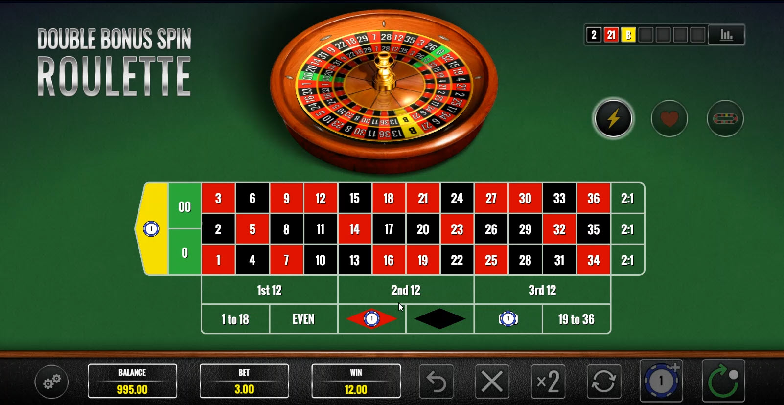 - यदि खिलाड़ी 0, 00 और बोनस के बीच तीन-तरफ़ा दांव लगाता है और गेंद उस शून्य में गिरती है, तो खिलाड़ी को 11 से 1 का भुगतान किया जाएगा, जैसा कि स्ट्रीट (तीन-संख्या) दांव के लिए मानक है। यदि गेंद बोनस स्थान पर गिरती है, तो खिलाड़ी को तुरंत अपने दांव के 3 गुना के बराबर एक त्वरित जीत प्राप्त होगी। फिर, खिलाड़ी बोनस स्पिन पर जाएगा। यदि बोनस स्पिन के परिणामस्वरूप एक बोनस पहिया बोनस स्थान पर गिरता है, तो खिलाड़ी 40 से 1 के अनुपात में जीतेगा। यदि बोनस स्पिन के परिणामस्वरूप दोनों बोनस पहिए बोनस स्थान पर गिरते हैं, तो खिलाड़ी 400 से 1 के अनुपात में जीतेगा। इसके अतिरिक्त, यदि कोई भी बोनस पहिया चुने गए शून्य में गिरता है, तो खिलाड़ी चुने गए शून्य में गिरने वाले प्रत्येक पहिये के लिए अतिरिक्त 11 इकाइयाँ जीतेगा।बोनस स्पिन से मिली जीत, तत्काल जीत को छोड़कर, शून्यों के लिए किसी भी जीत को गिनते हुए, मूल स्पिन की जीत में जोड़ दी जाएगी। उस जीत का भुगतान भी "एक" के आधार पर किया जाएगा (मेरा सिर घूम रहा है), सिवाय इसके कि जीत केवल मूल जीत के लिए हो। बोनस व्हील्स जहाँ भी उतरते हैं, उसके अनुसार खिलाड़ी कितना जीतता है, इसका मूल विवरण यहाँ दिया गया है। ये जीतें "एक" के आधार पर होती हैं।