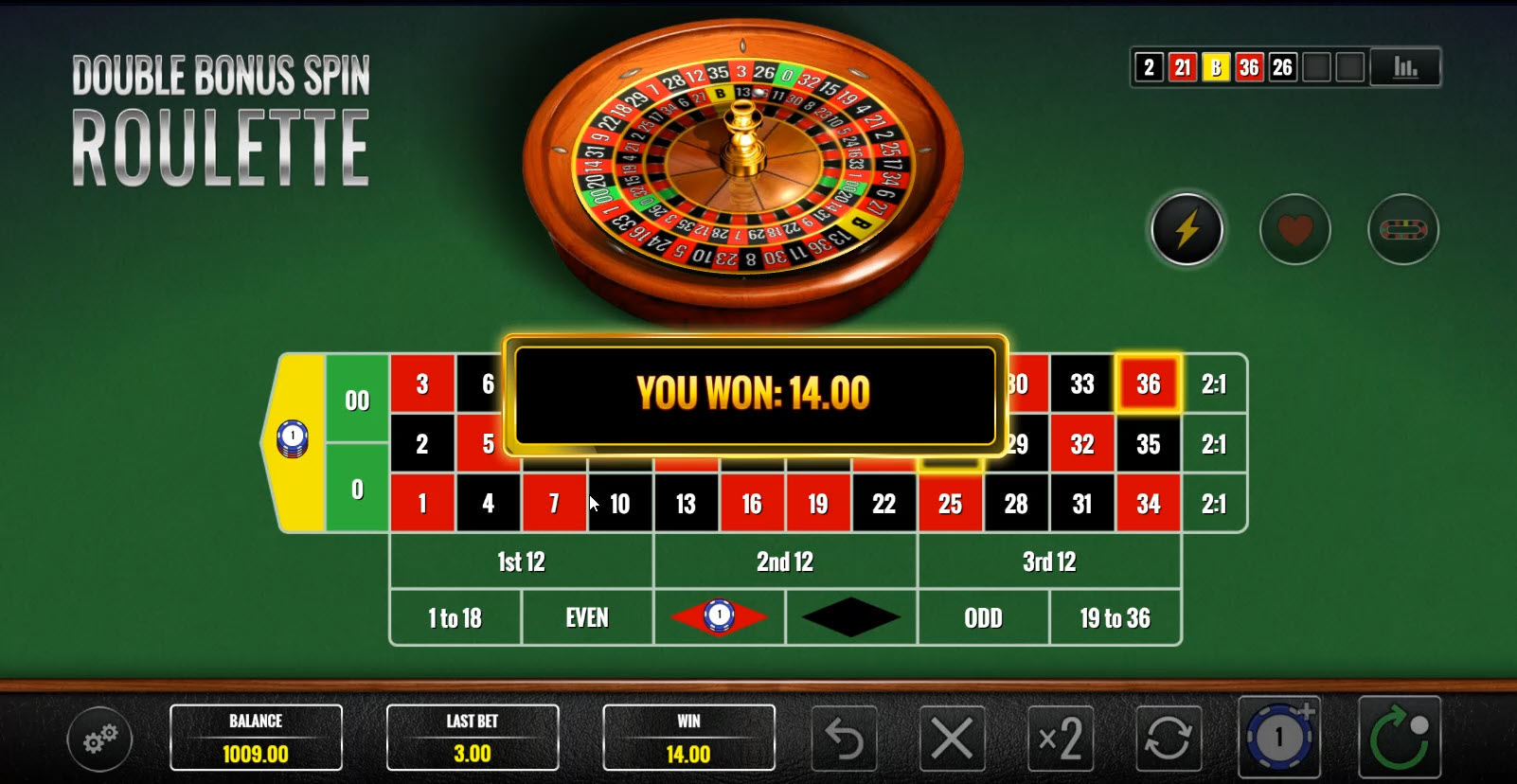 - बोनस स्पिन बेट के अलावा किसी भी अन्य बेट के लिए, यदि गेंद बोनस स्पेस में गिरती है, तो खिलाड़ी को बोनस स्पिन में प्रत्येक पहिये के लिए एक, जीतने के दो अवसर मिलेंगे। यदि खिलाड़ी दोनों पहियों पर जीतता है, तो उसे एक पहिये पर जीतने की तुलना में दोगुना लाभ मिलेगा। बेट, बेट की राशि और भुगतान तालिका प्रारंभिक स्पिन के समान ही होगी। यदि खिलाड़ी बोनस स्पिन में कम से कम एक पहिये पर जीतता है, तो उसे अपना मूल बेट वापस मिल जाएगा। यदि किसी भी पहिये का परिणाम शून्य आता है, तो उसे हार माना जाएगा।
