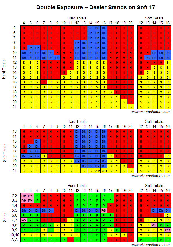 निम्नलिखित तालिकाएं डबल एक्सपोजर के लिए मूल रणनीति दिखाती हैं जब डीलर सॉफ्ट 17 पर खड़ा होता है। रणनीति का उपयोग करने के लिए, शीर्ष पंक्ति के साथ खिलाड़ी के हाथ और बाएं कॉलम के साथ डीलर के हाथ को देखें।