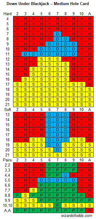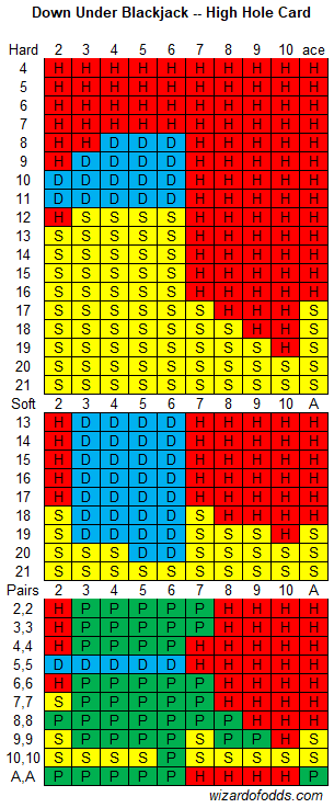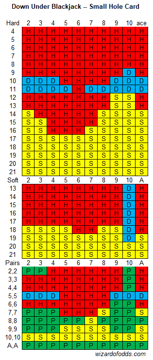 डाउन अंडर ब्लैकजैक में खिलाड़ी डीलर के खिलाफ न केवल एक कार्ड जानते हैं, बल्कि "डाउन अंडर" कार्ड के बारे में भी कुछ जानते हैं। अधिक सटीक रूप से कहें तो, डीलर खिलाड़ियों को बताएगा कि डाउन कार्ड छोटा है, मध्यम है या बड़ा। बेशक, कैसीनो में कुछ भी मुफ़्त नहीं मिलता। इसका एक फायदा यह है कि, ज़्यादातर मामलों में, अगर डीलर के पास 22 अंक होते हैं, तो कोई भी खिलाड़ी जीतने के बजाय आगे बढ़ जाता है।