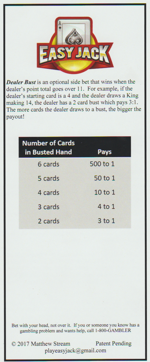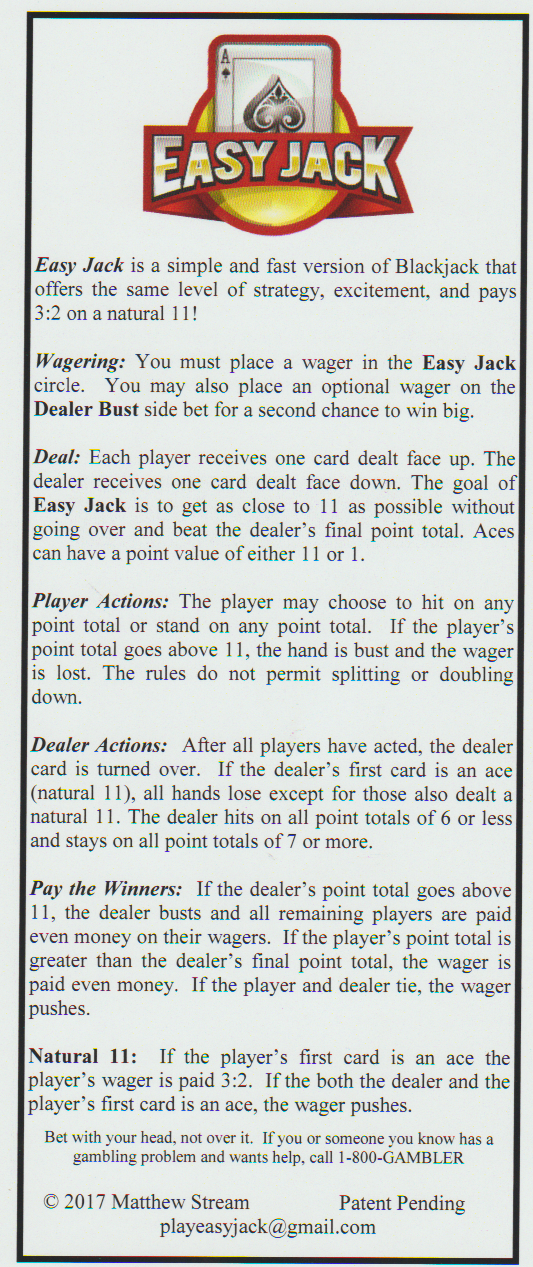 ईज़ी जैक को मोटे तौर पर ब्लैकजैक का एक प्रकार कहा जा सकता है जहाँ लक्ष्य डीलर की तुलना में 11 के करीब पहुँचना होता है, बिना उससे आगे बढ़े। इसे मैथ्यू स्ट्रीम ने बनाया था और 21 जून, 2017 को लास वेगास के हैराह में इसका फील्ड ट्रायल हुआ था। मैंने इसे 30 जून, 2017 को वहीं देखा और खेला था।