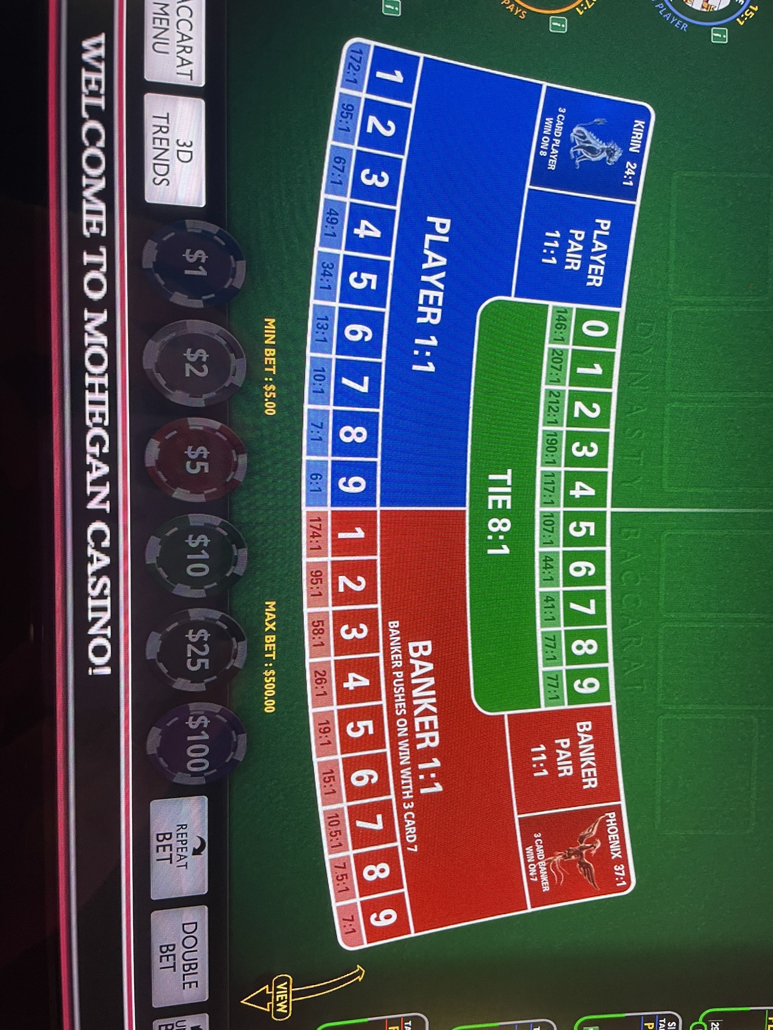 कुछ बैकारेट गेम सटीक जीत (या बराबरी) और जीत (या बराबरी) के कुल योग पर साइड बेट्स की पेशकश करते हैं। नीचे दी गई तस्वीर 2024 ग्लोबल गेमिंग एक्सपो में एक इलेक्ट्रॉनिक टेबल गेम पर देखे गए ऐसे ही बेट्स का एक उदाहरण दिखाती है।