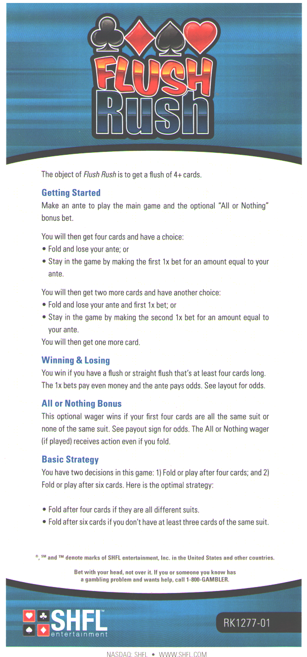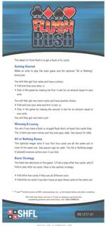 फ्लश रश एक नया टेबल गेम है जिसे मैंने पहली बार मई 2014 में लास वेगास के डी कैसीनो में देखा था। यह गेम हाई कार्ड फ्लश में फ्लश के महत्व और मिसिसिपी स्टड में रेज या फोल्ड बेटिंग संरचना को जोड़ता है। खिलाड़ी के अंतिम हाथ में फ्लश या स्ट्रेट फ्लश जितना लंबा होगा, वह उतना ही अधिक जीतेगा।