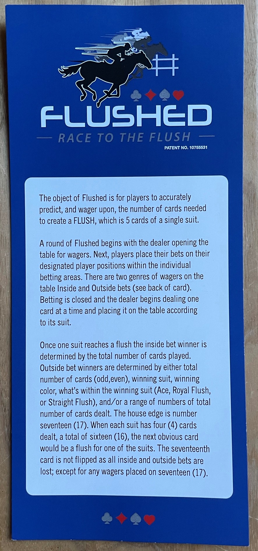 - अगर डीलर बिना फ्लश के 16 कार्ड तक पहुँच जाता है, तो 17 कार्डों पर लगी बाजी को छोड़कर बाकी सभी बाजी हार जाएँगी। ध्यान दें कि इस स्थिति में, 17वें कार्ड से फ्लश बनना ज़रूरी है क्योंकि सभी चार सूटों में पहले से ही चार की गिनती है।