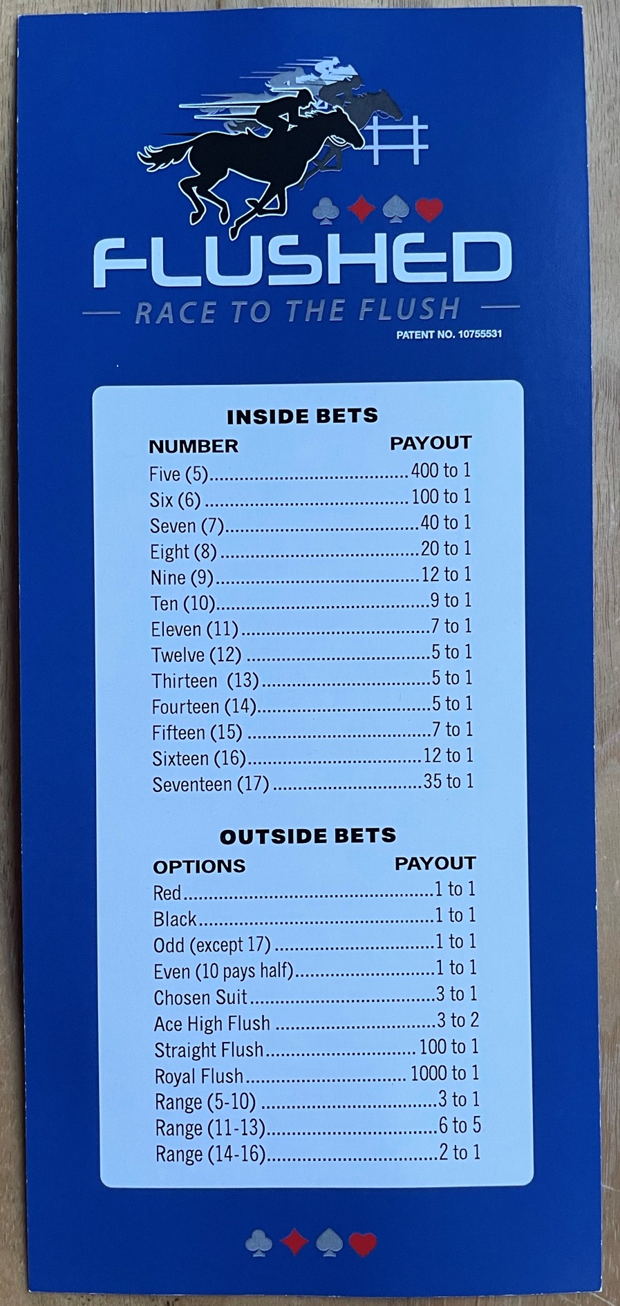 निम्नलिखित तालिका उपलब्ध "बाहरी दांव" दिखाती है, जो बांटे गए कार्डों की संख्या और वास्तव में बने फ्लश के आधार पर विविध दांव हैं। भुगतान "एक" के आधार पर होता है।