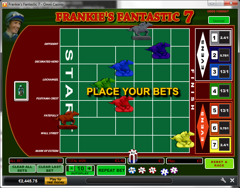 - अगर दो घोड़े एक साथ जीतते हैं, तो प्रत्येक को कुल रिटर्न का आधा हिस्सा मिलेगा। स्पष्ट रूप से, लेन 1 और 7 के घोड़े 1.7 से 1 के अनुपात में जीतेंगे, लेन 2 और 6 के घोड़े 3.375 से 1 के अनुपात में जीतेंगे, और बाकी 7 से 1 के अनुपात में जीतेंगे।