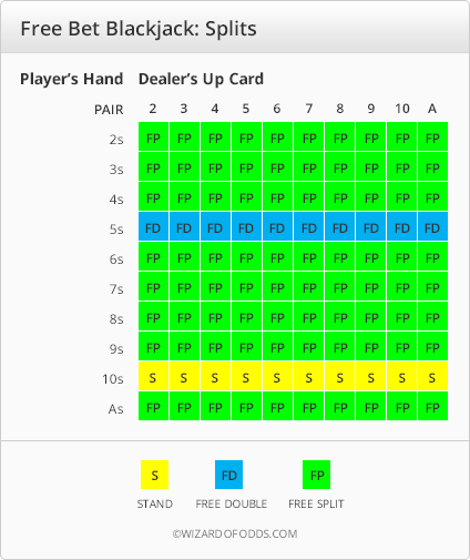 - 10 के अलावा सभी जोड़ियों पर "फ्री स्प्लिट्स"। "फ्री स्प्लिट" में, खिलाड़ी के दो कार्ड दो एक-कार्ड वाले हाथों में बाँट दिए जाते हैं। खिलाड़ी का मूल दांव पहले हाथ से लगाया जाता है और दूसरे हाथ से "फ्री बेट" बटन लगाया जाता है। खिलाड़ी एक-एक करके प्रत्येक हाथ खेलता है और दोनों हाथों पर "फ्री डबल" या "फ्री स्प्लिट" का हकदार होता है। जीतने वाले हाथों के लिए, प्रत्येक "फ्री बेट" बटन को मूल दांव के बराबर असली चिप्स से बदल दिया जाता है। जिन हाथों में खिलाड़ी हार जाता है या पुश करता है, डीलर "फ्री बेट" बटन वापस ले लेता है।