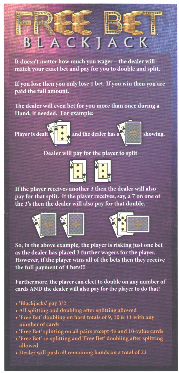 फ्री बेट ब्लैकजैक, खेल के आविष्कारक ज्योफ हॉल द्वारा विकसित ब्लैकजैक का एक प्रकार है। इसकी ख़ासियत यह है कि खिलाड़ी को (ज़्यादातर समय) स्प्लिटिंग या डबलिंग करते समय अपना पैसा जोखिम में नहीं डालना पड़ता। यह ऐसा है जैसे आप टेबल पर किसी उदार प्रेमी के साथ खेल रहे हों जो आपके लिए सभी अतिरिक्त दांव लगाता है और आपको जीत की रकम रखने देता है। इसमें क्या दिक्कत है? ज्योफ के दूसरे खेल, ब्लैकजैक स्विच की तरह, अगर डीलर को 22 मिलता है, तो बाकी बचे सभी दांव दांव पर लग जाते हैं।