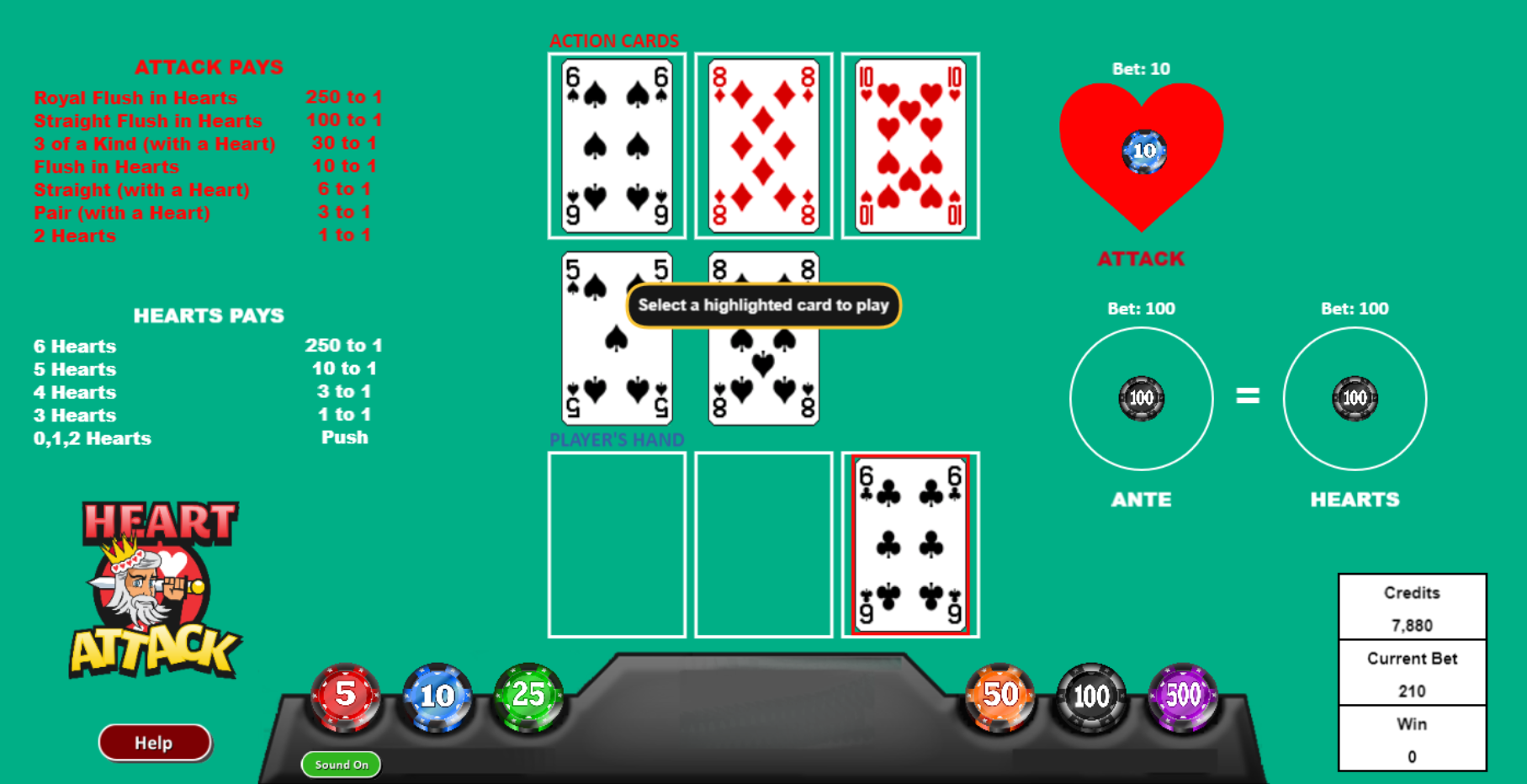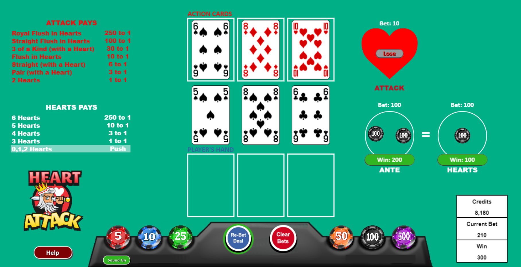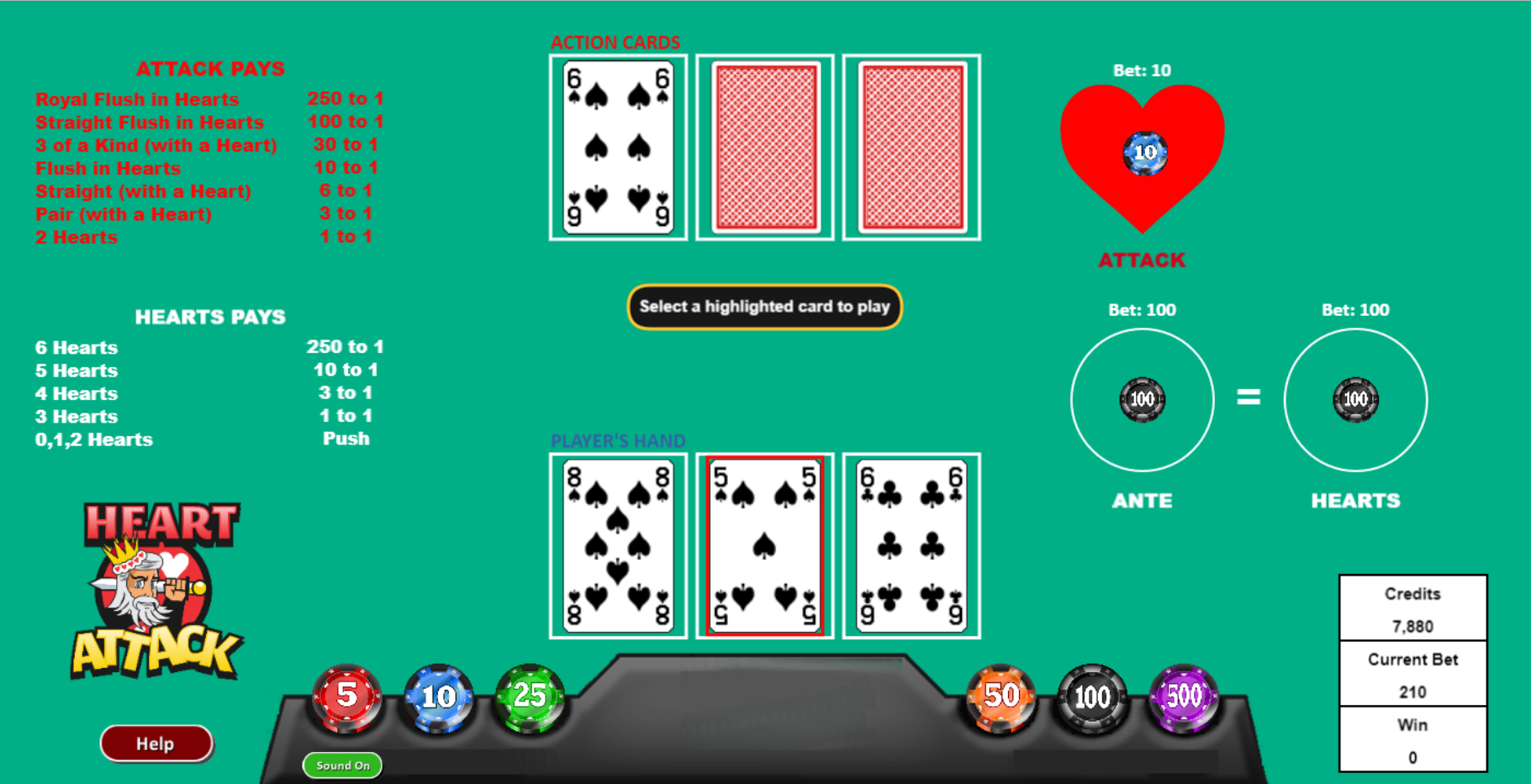 नीचे मुफ़्त डेमो गेम के ज़रिए खेले जाने वाले एक उदाहरण गेम का उदाहरण दिया गया है। पहली तस्वीर में आप देख सकते हैं कि मैंने एंटे और हार्ट्स बेट पर $100 और अटैक बेट पर $10 का दांव लगाया है। यह एक दुर्लभ स्थिति है जहाँ मैं बिना हार्ट के तीनों कार्ड खेल सकता हूँ, क्योंकि तीनों कार्ड डीलर के पहले कार्ड से रैंक या सूट में मेल खाते हैं।