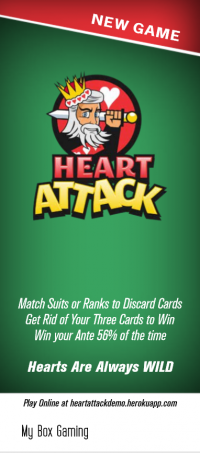 हार्ट अटैक एक टेबल गेम है जो, जहाँ तक मुझे पता है, 2019 की शुरुआत में कनेक्टिकट के फॉक्सवुड्स कैसीनो में पहली बार सामने आया था। इसके नियमों की तुलना किसी भी अन्य ज्ञात खेल से करना मुश्किल है। अगर मजबूर किया जाए, तो यह कुछ हद तक ऊनो जैसा है, जहाँ खिलाड़ी डीलर द्वारा रैंक या सूट में दिए गए कार्डों का मिलान करके कार्ड से छुटकारा पाने की कोशिश करता है। इसमें एक नया मोड़ यह है कि हार्ट्स वाइल्ड होते हैं।