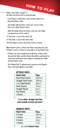 - खेल की शुरुआत खिलाड़ी द्वारा एंटे और हार्ट्स दांव पर बराबर दांव लगाने से होती है। खिलाड़ी इस समय अटैक साइड बेट भी लगा सकता है।