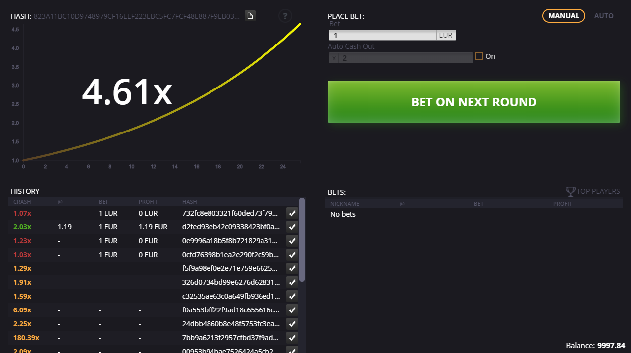 - खेल की शुरुआत खिलाड़ी द्वारा दांव लगाने से होती है। यह खेल के बीच के पाँच सेकंड के दौरान या खेल के दौरान "अगला राउंड खेलें" पर क्लिक करके किया जा सकता है।