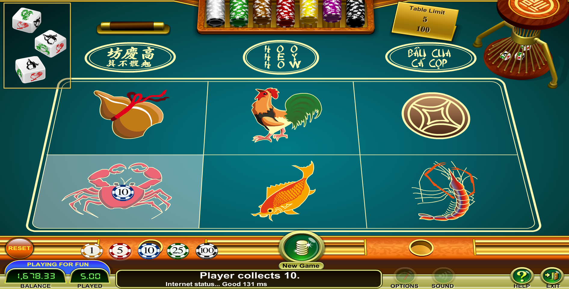 - तीन पासे इस्तेमाल किए जाते हैं। प्रत्येक पासे पर निम्नलिखित प्रतीक होते हैं: मछली, झींगा, बकरा, सिक्का, केकड़ा और मुर्गा।