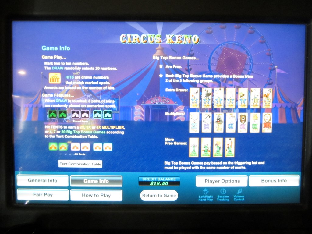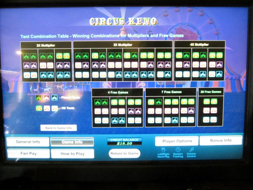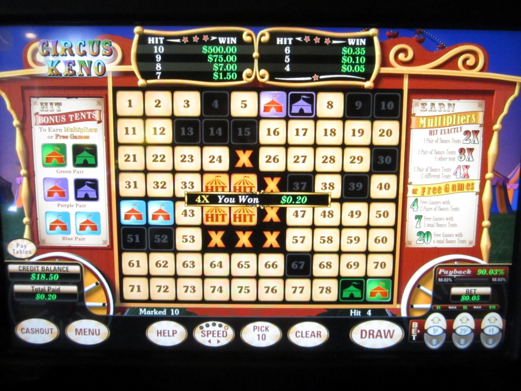 सर्कस केनो, यू1 गेमिंग द्वारा निर्मित मल्टी-गेम मशीनों पर उपलब्ध एक गेम है। मैंने लास वेगास क्लब, रैम्पर्ट और डॉटीज़ कसीनो में ऐसी मशीनें देखी हैं। सर्कस केनो की खासियत यह है कि खिलाड़ी द्वारा अपने नंबर चुनने के बाद, गेम बाकी बचे नंबरों में से छह सर्कस टेंट बेतरतीब ढंग से चुनता है। 20 नंबरों वाले सर्कस टेंट पर हिट करके, खिलाड़ी मल्टीप्लायर या एक मुफ़्त स्पिन बोनस जीत सकता है।