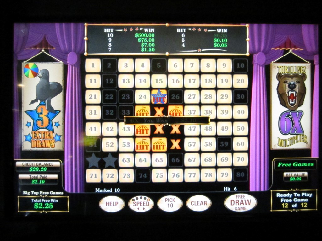 ऊपर और दाईं ओर की तस्वीर एक बोनस स्पिन थी। शुरुआती स्पिन पर मैंने $0.05 का दांव लगाया और दस नंबर चुने, जो बोनस स्पिन तक चले गए। मेरे दो बोनस तीन अतिरिक्त गेंदें और एक 6x गुणक थे। आम तौर पर, मैं पाँच नंबर पकड़ता, लेकिन तीन अतिरिक्त गेंदों में से एक 25 नंबर पर लगी, कुल छह कैच और $0.35 की मूल जीत। फिर, 6x गुणक ने उस स्पिन के लिए मेरी अंतिम जीत को $0.35 * 6 = $2.10 कर दिया।