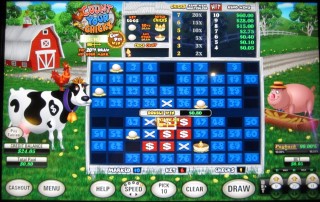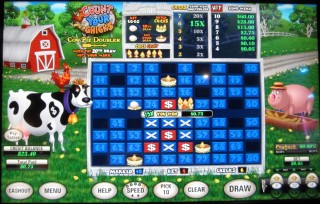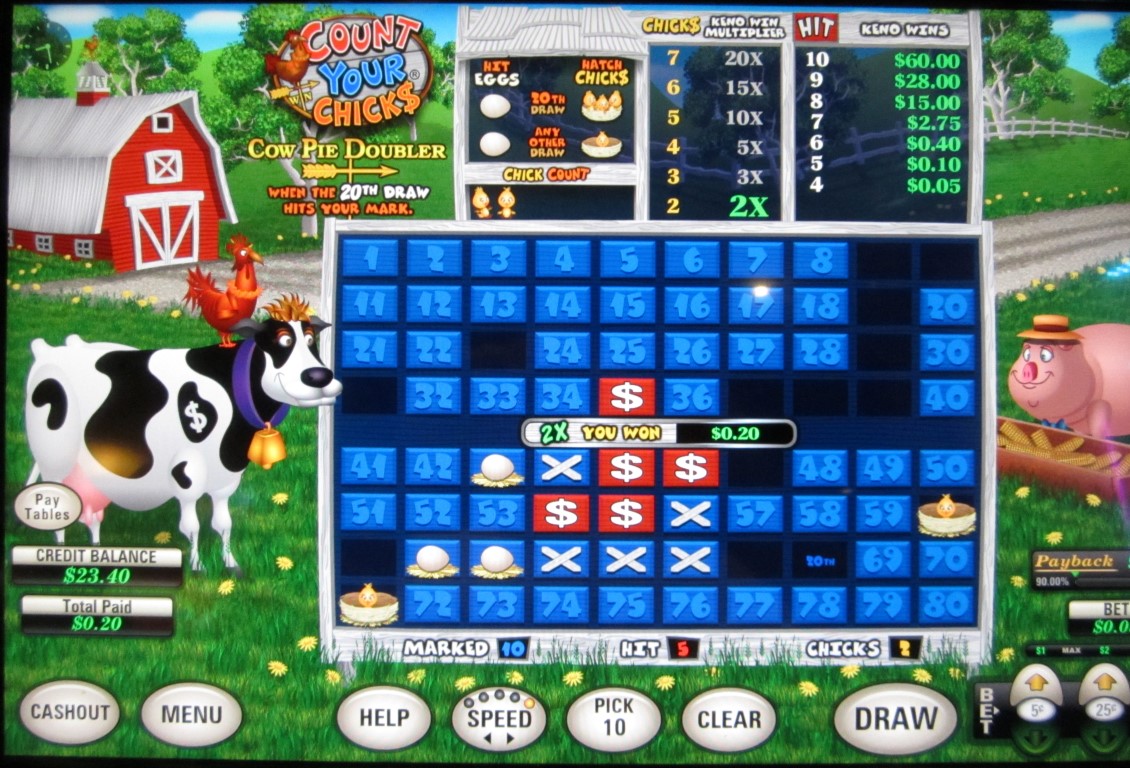 तीसरे उदाहरण में, मैंने 5¢ का दांव लगाया और दस नंबर चुने। मैंने उनमें से छह नंबर पकड़े, जिससे मेरी आधार जीत 40¢ हो गई। केवल एक चूज़ा ही निकला, इसलिए उसके लिए कोई गुणक नहीं। हालाँकि, 20वीं गेंद मेरे चुने हुए नंबर 45 पर लगी, जिससे काउ पाई हिट हुआ और गुणक 2x हो गया। काउ पाई हिट को एक वेदर वेन से दर्शाया गया है। शायद यह एक अंदरूनी मज़ाक है जिसे समझने के लिए किसान होना ज़रूरी है। काउ पाई गुणक पर विचार करने के बाद, मेरी अंतिम जीत 40¢ × 2 = 80¢ थी।